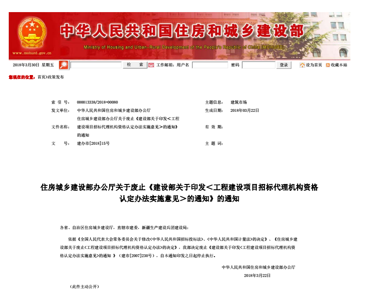《住房城鄉(xiāng)建設(shè)部關(guān)于廢止<工程建設(shè)項(xiàng)目招標(biāo)代理機(jī)構(gòu)資格認(rèn)定辦法>的決定》已經(jīng)2018年2月12日第37次部常務(wù)會(huì)議審議通過,現(xiàn)予發(fā)布,自發(fā)布之日起施行。