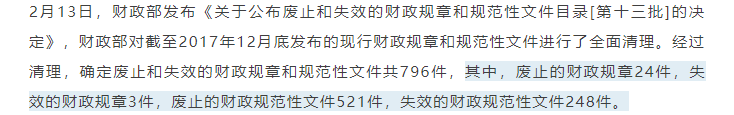 為了適應(yīng)依法行政、依法理財?shù)男枰鶕?jù)《財政部規(guī)章和規(guī)范性文件清理工作規(guī)則》,我部對截至2017年12月底發(fā)布的現(xiàn)行財政規(guī)章和規(guī)范性文件進(jìn)行了全面清理。經(jīng)過清理,確定廢止和失效的財政規(guī)章和規(guī)范性文件共796件,其中,廢止的財政規(guī)章24件,失效的財政規(guī)章3件,廢止的財政規(guī)范性文件521件,失效的財政規(guī)范性文件248件。現(xiàn)將廢止和失效的財政規(guī)章和規(guī)范性文件的目錄予以公布。
